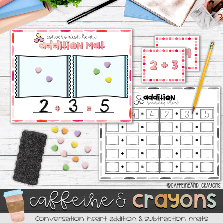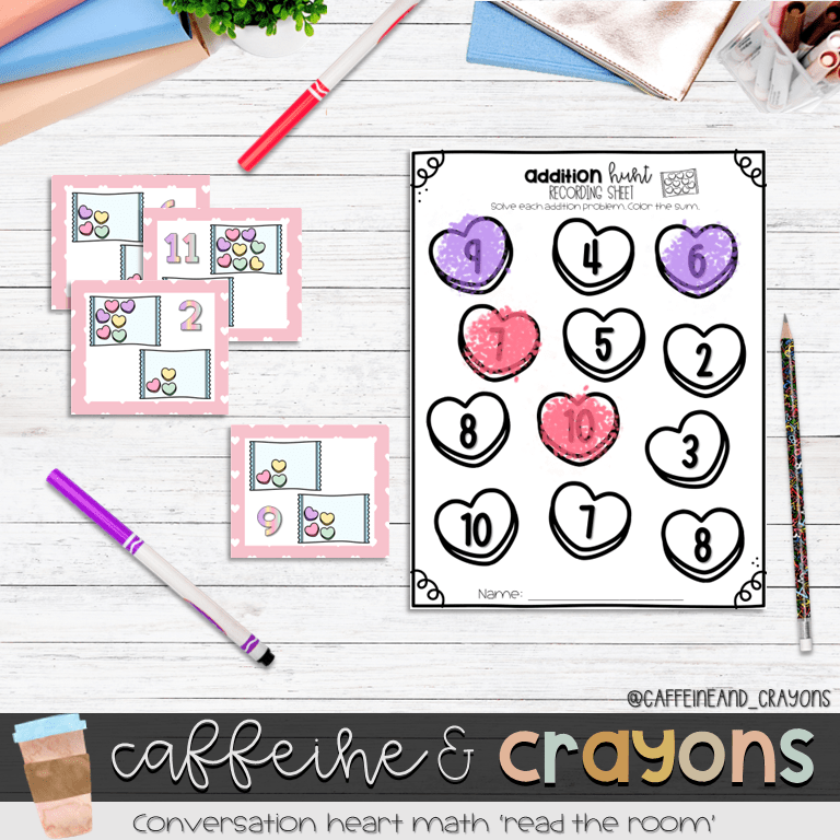 Prep– I print out and copy the graph, sorting mats, and choose which extension activity I want to include (my download comes with a data gathering sheet and heart addition). There is a full color sorting mat that can be printed off and laminated ahead of time. You’ll need a few bags of candy hearts. I found these ‘end of conversation’ hearts. Ha!