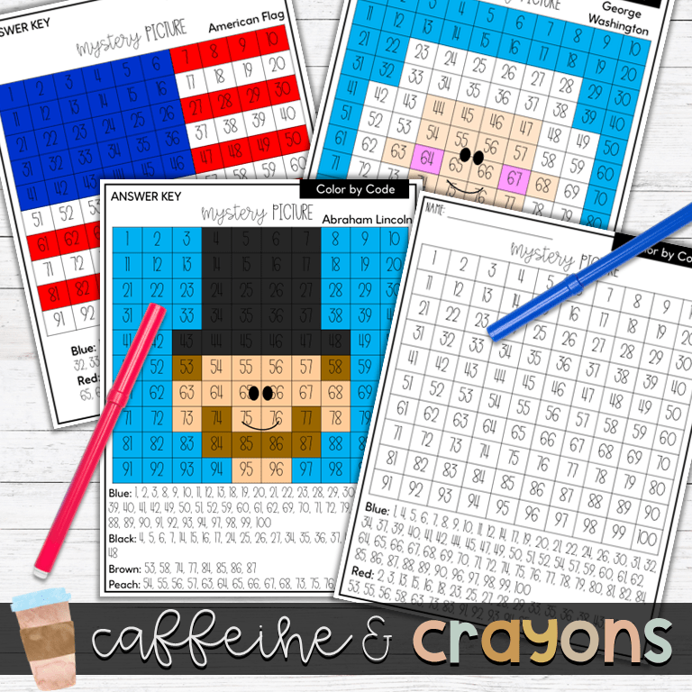 Next math center is a crowd favorite- MYSTERY PICTURES! Students color in the 100’s chart according to the color code to reveal a picture. This set has national symbols, too!