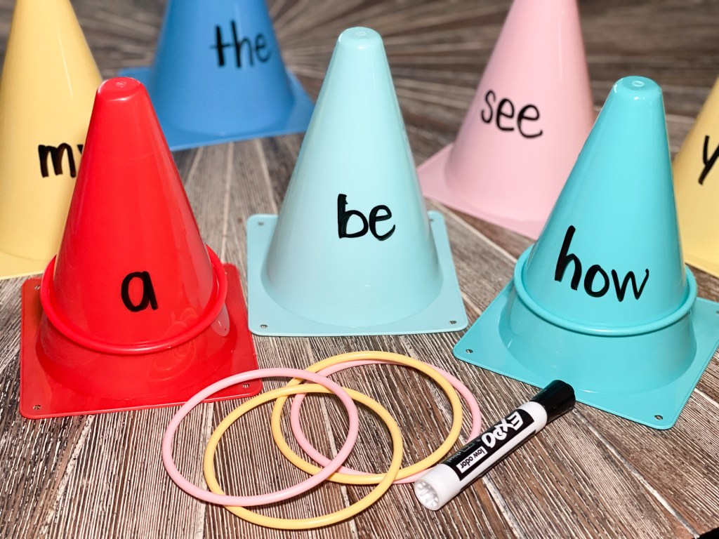 - Have the students take turns tossing all of the rings (so at least one makes it onto a cone). Have them call out the word (or whatever skill you’re practicing) on the cones that they make it on.