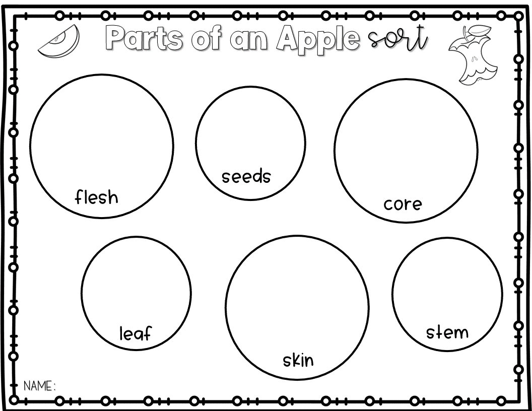 Cut apart an apple and sort the parts. Students can sort the apples on their paper or do together and draw the parts on the paper.
