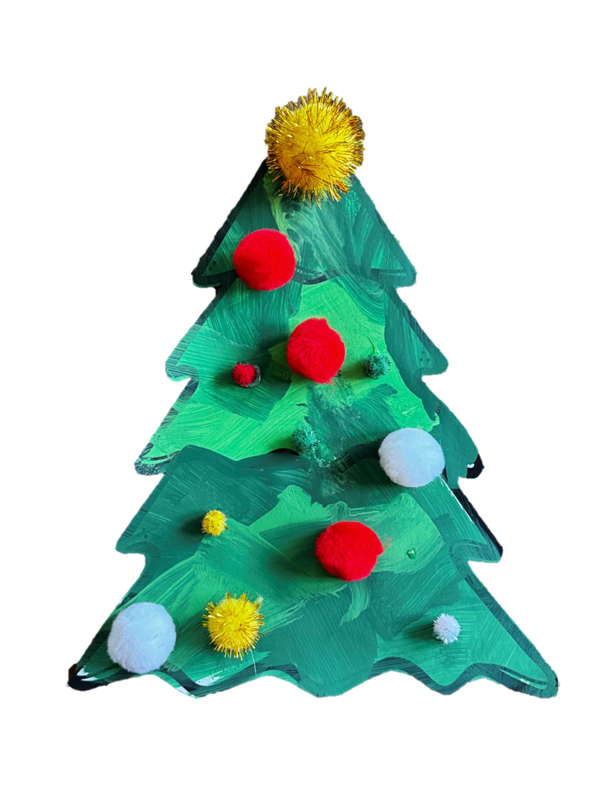 I used Christmas Tree template 1, acrylic paint (brave, I know), foam paintbrush, and pompoms.