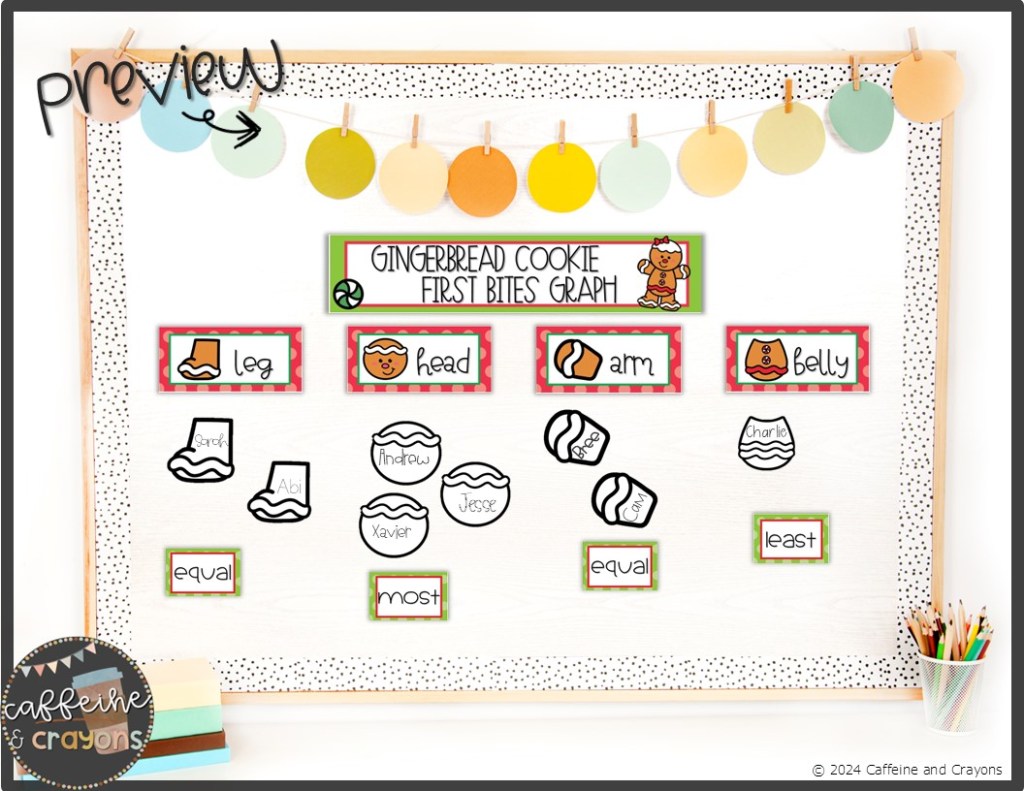 Have students take a bite of a gingerbread cookie. Graph all of the classes’ first bites together. Which cookie part had the most 1st bites and the least?